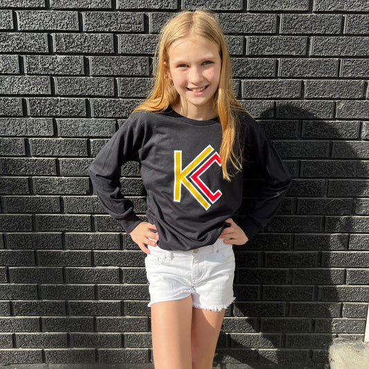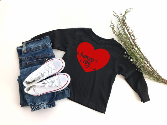Kids Youth Kansas City Cursive Heart | Black Sweatshirt Long & Short Sleeve T-Shirt | Perfect for Game Day! Soft! Made here in KC!
