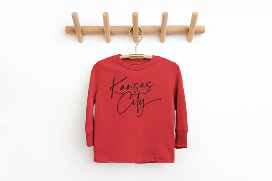 Kids Youth Kansas City Red Sweatshirt Long & Short Sleeve T-Shirt | Perfect for Game Day! | Soft! | Retro Cursive Masculine