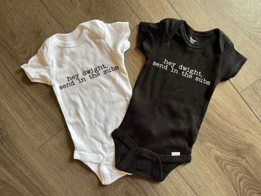 Regular price From $17.00Regular priceUnit price / per$0.00Sale price From $17.00Announce Your Pregnancy! Hey Dwight, Send in The Subs Office Gerber ONESIE® Se 0-3, 3-6, 6-9 months Pam & Jim baby shower gift